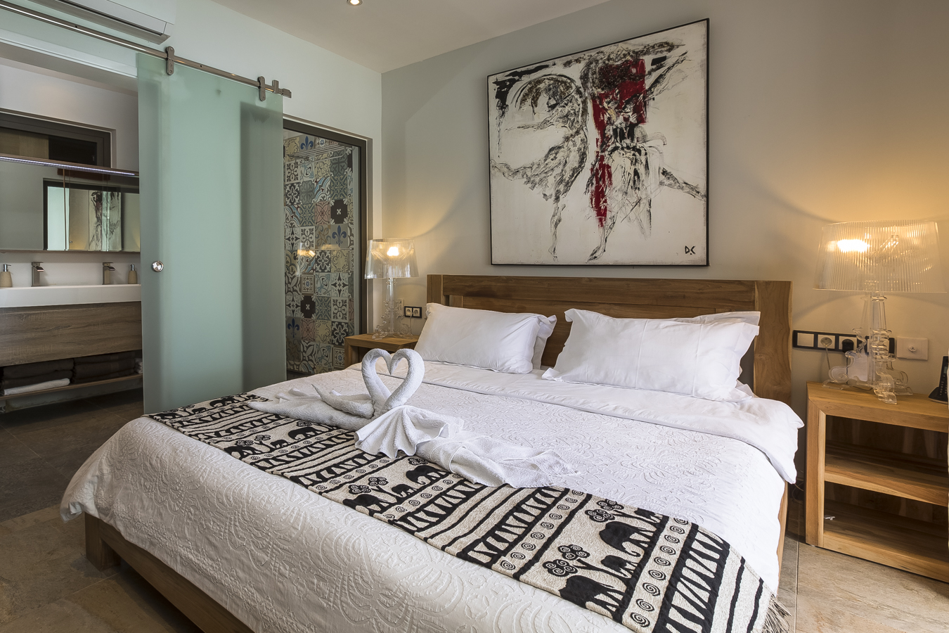 The master bedroom is en-suite and leads directly to a comfortable outdoor lounge on the terrace. The second bedroom with a double bed leads directly to a little private terrace that will be the perfect place to read a good book. The third bedroom at the back has also a double bed and shares the bathroom with the second bedroom.
