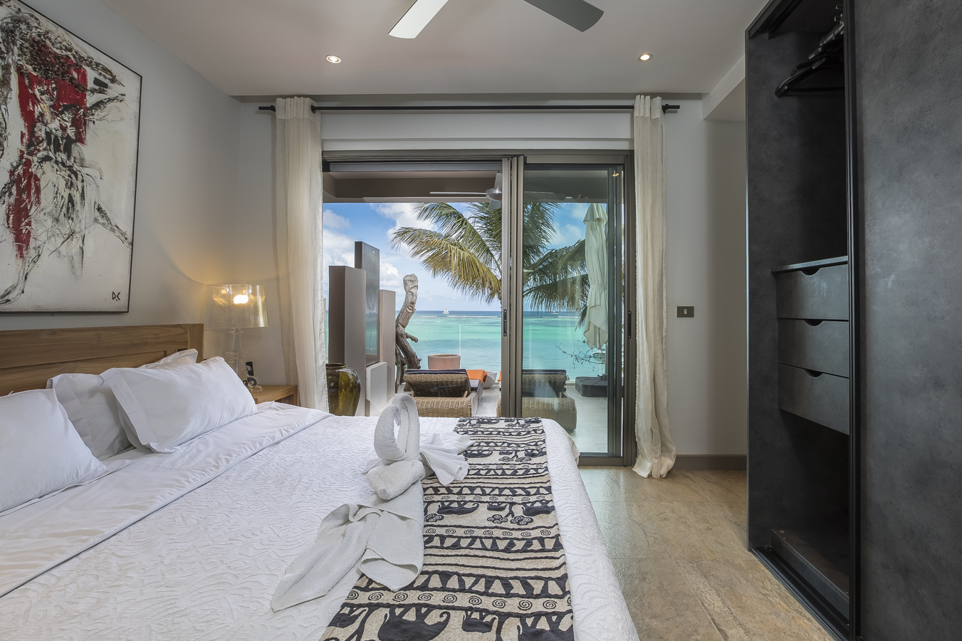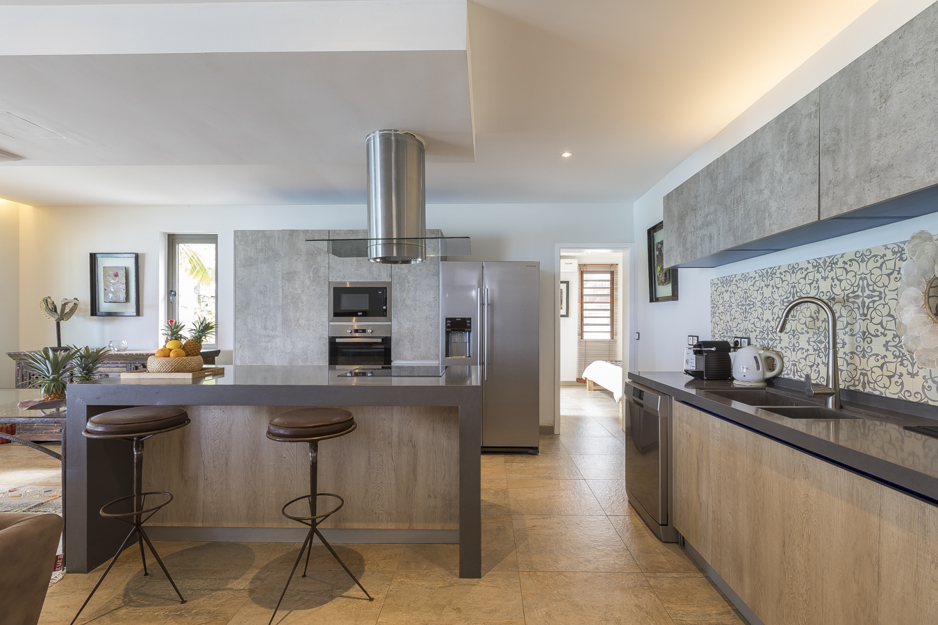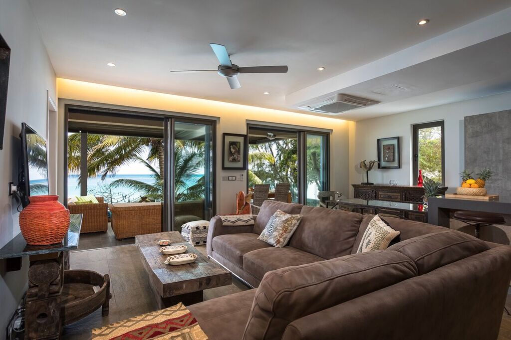 The living room, furnished and tastefully decorated, consists of a large comfortable living room with television, a small dining table and an open kitchen. Open the large sliding doors and enjoy the terrace and the breathtaking view over the Indian Ocean. Ideal for relaxing on a warm and sunny day or a drink in the evening with your loved ones.