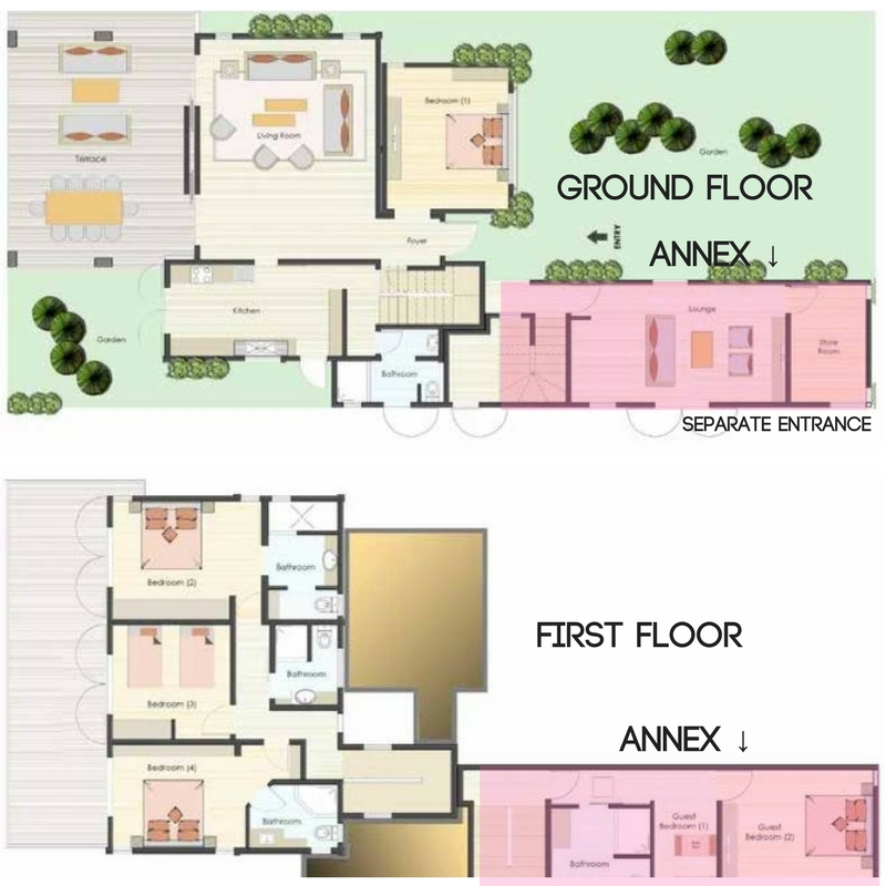 - 1 bedroom and bathroom is located in the Annex and shall be available for a booking of 9-10 person