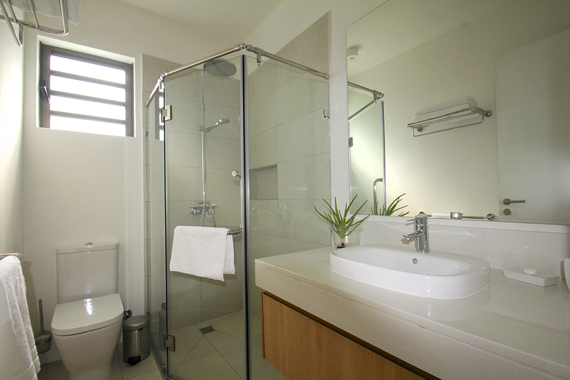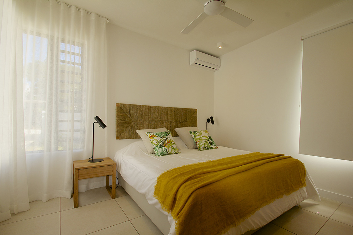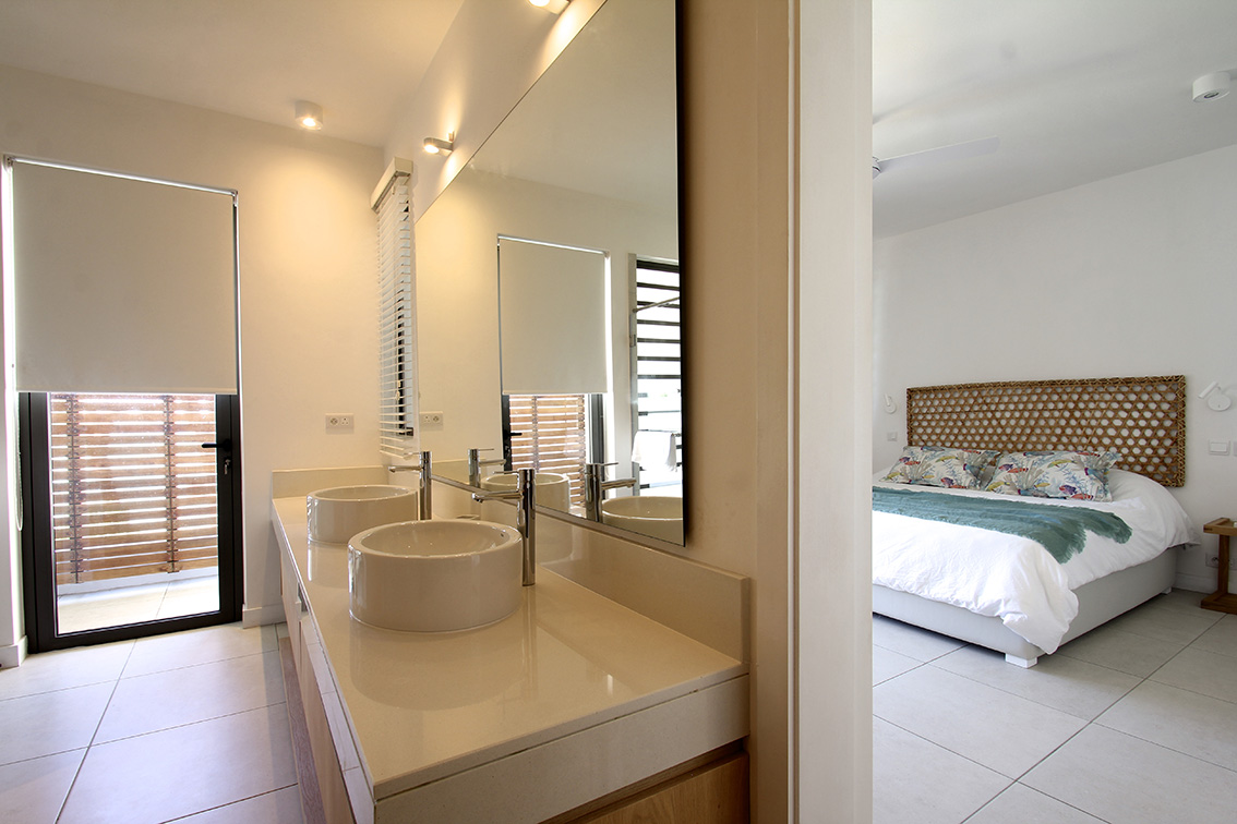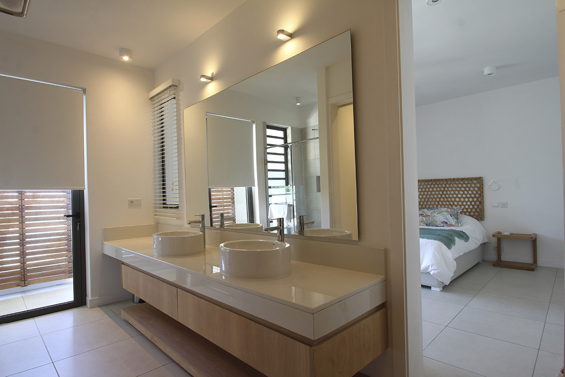 The living room, furnished and tastefully decorated, consists of a large comfortable living room with television, a large dining table and an open kitchen. Between the living room to the terrace, there is only 1 small step and BIG sliding doors : outdoor living is so special in Mauritius ! The breath-taking view over the Grand-Baie bay and Gunner’s Point is something you will never forget.