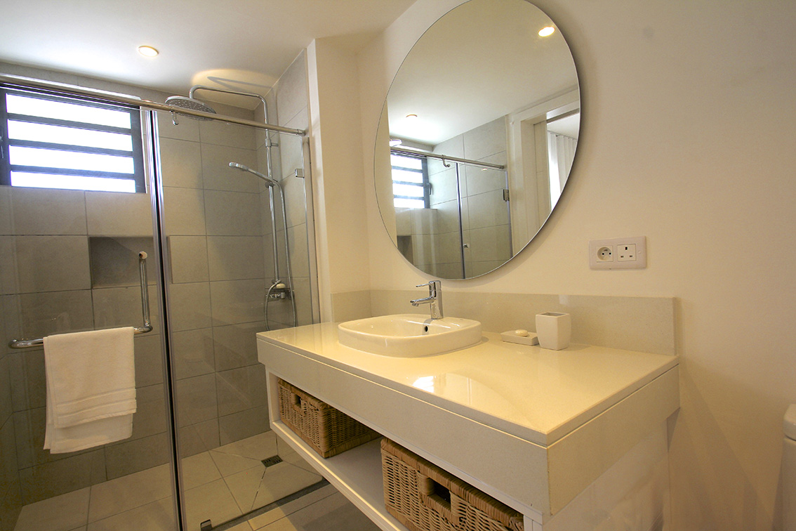 All bedrooms are en-suite and air-conditioned. The master bedroom with double bed has a very nice sea view. The second bedroom with twin beds has sea view too. The third bedroom with double bed is at the back.