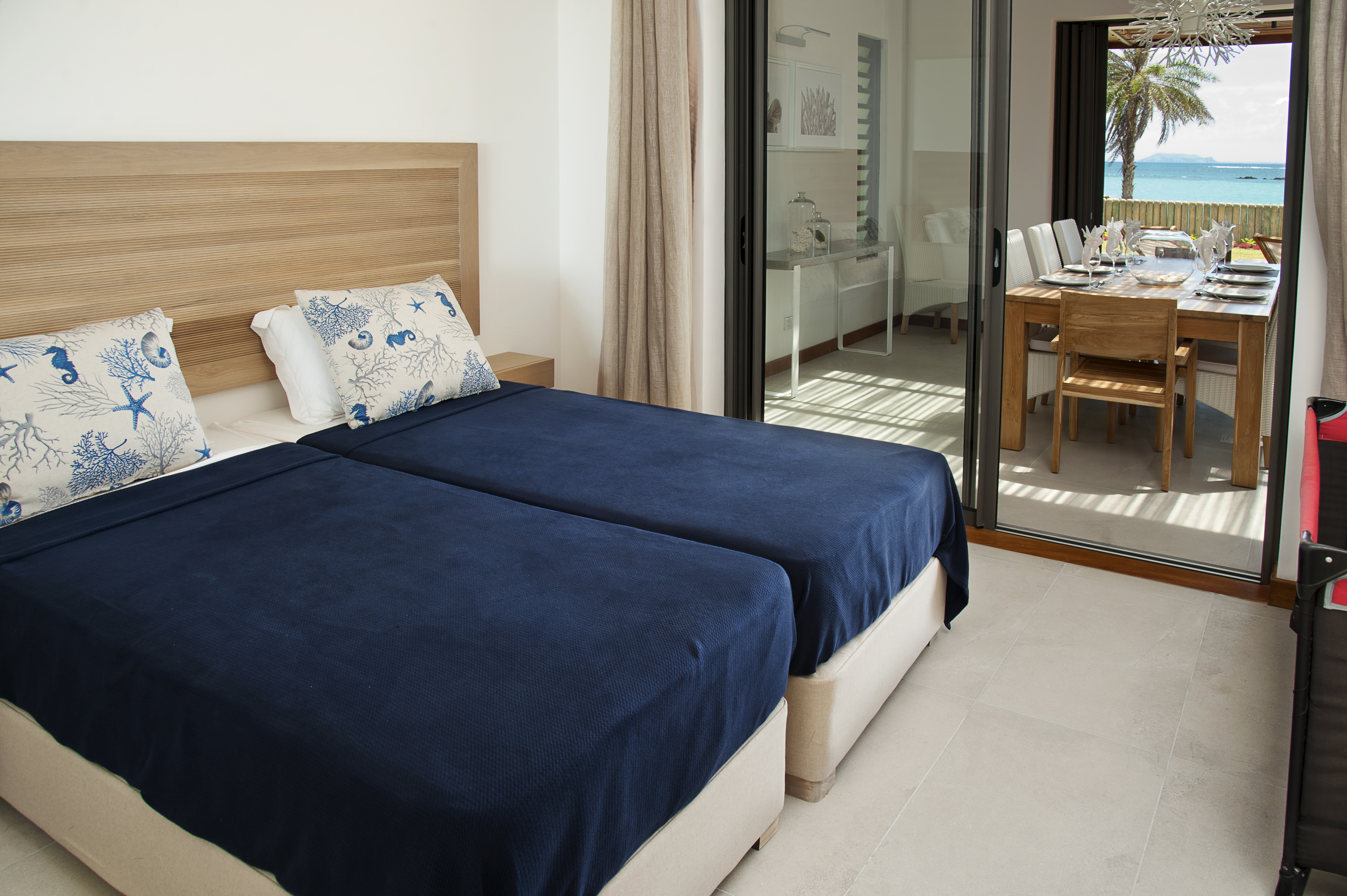 3 chambres à coucher en-suite (2 lits doubles, 1 avec deux lits simples), dont une avec vue sur la mer et sortie directe sur la terrasse. Une télévision, un placard et une baignoire pour votre confort supplémentaire.