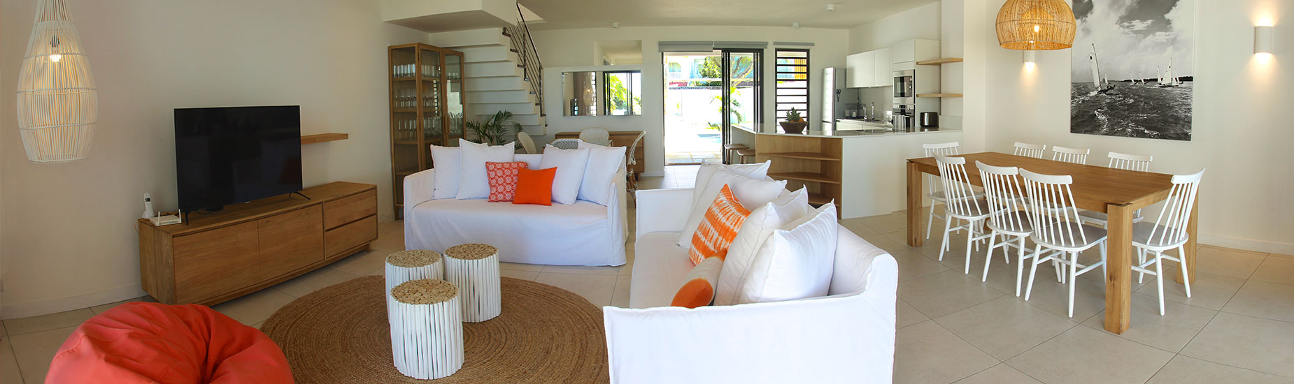 La pièce à vivre, meublée et décorée avec goût, se compose d’un grand salon confortable avec télévision, d’une grande table à manger et d’une cuisine ouverte. Entre le salon et la terrasse, il n’y a qu’une petite marche et de grandes portes coulissantes : la vie en plein air est si spéciale à l’île Maurice ! La vue à couper le souffle sur la baie de Grand-Baie et Gunner’s Point est quelque chose que vous n’oublierez jamais.